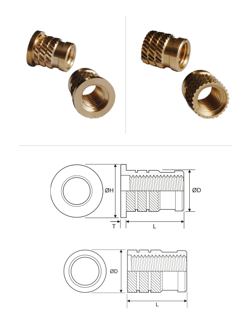 Available with or without head and suitable for heated or cold press-in installation into plastics.